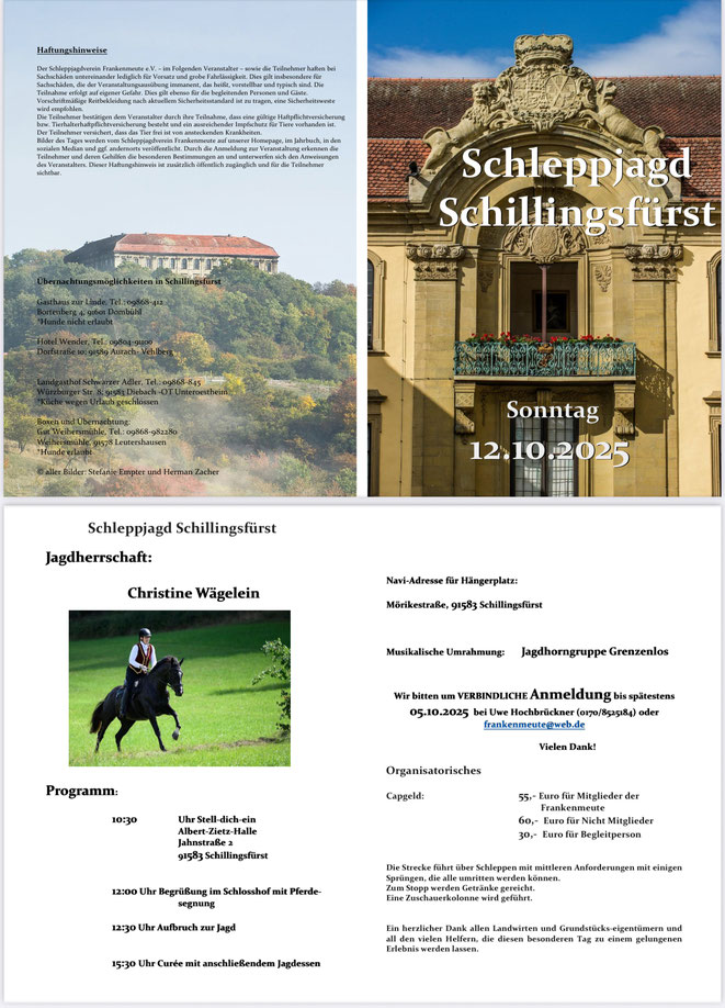Am Sonntag, 12.10.2025 reiten wir die Schleppjagd auf Schloss Schillingsfürst.