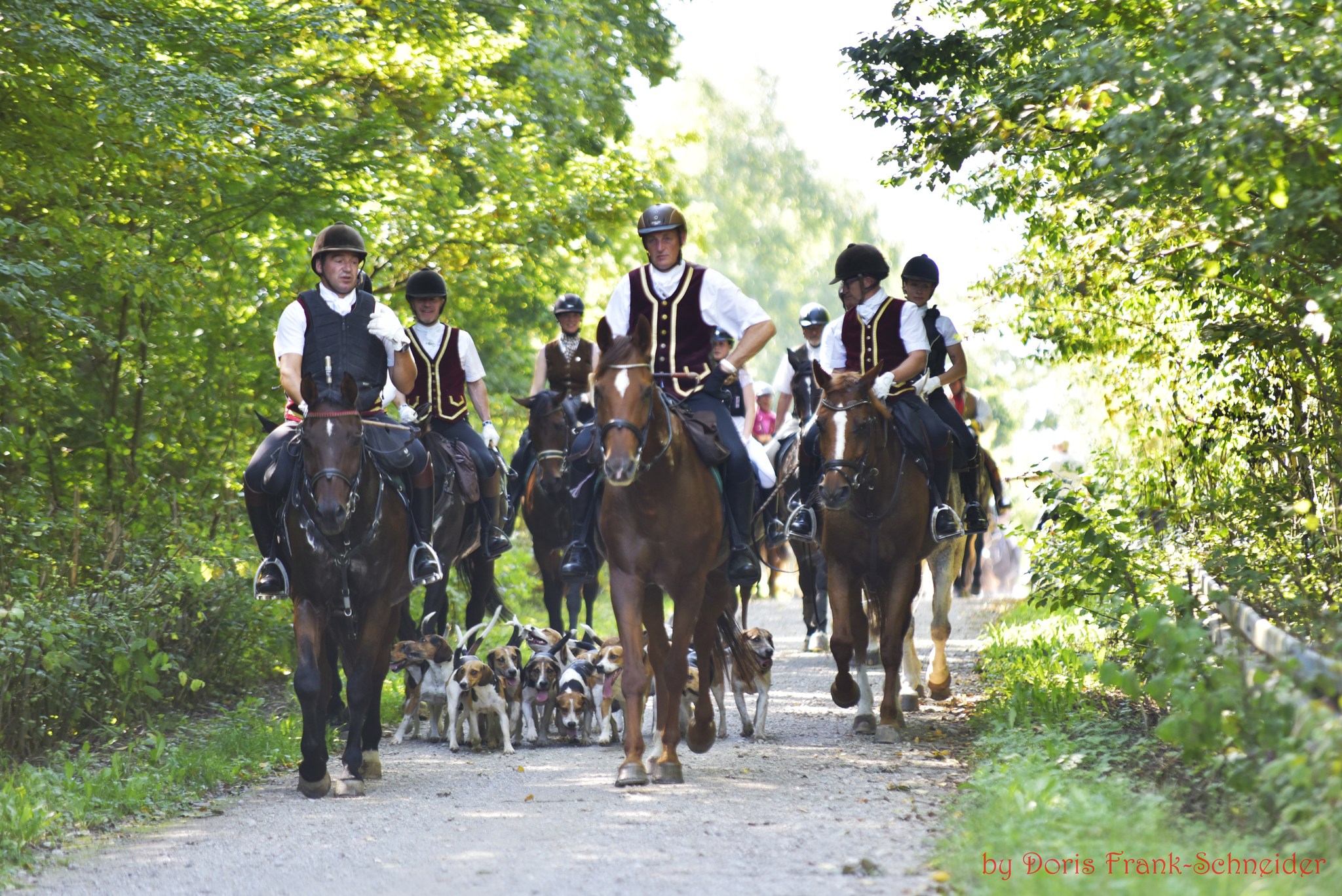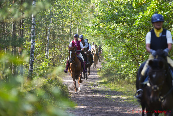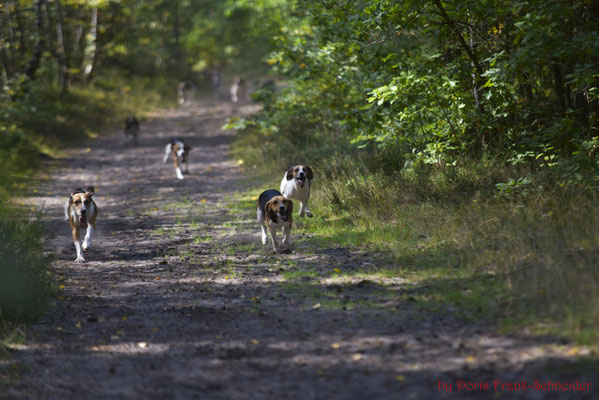 Die traumhaften Möglichkeiten im Gelände des Nürnberger Reichswald mit seinen herrlichen Sandwegen, die gerne in schmalen Trampelpfaden münden und den schnellen Richtungswechseln fordern die volle Konzentration von Reiter und Pferd. Immer wieder konnte das Jagdgeschehen von den Zuschauern beobachtet werden, wenn die Hunde und Reiter deren Weg kreuzten, um dann schnell wieder im Wald zu verschwinden – dann aber noch das Geläut der Hunde auf der Schleppe, den Hufschlag und die Klänge der Hörner im Ohr – ein Genuss für alle Sinne!