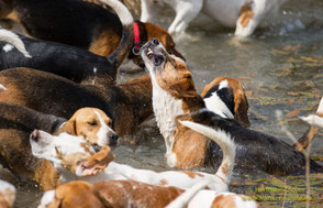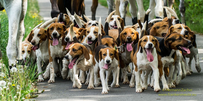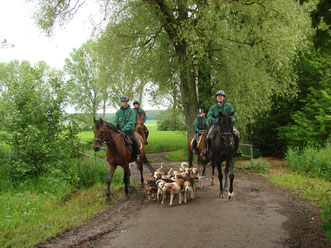 Wenn die Basics sitzen, beginnt die Meutearbeit zu Pferde. Zunächst wieder auf kleinere Gruppen aufgeteilt, dann allmählich mit dem ganzen Pack. Dabei werden die Hunde zunächst zu Pferde geführt, dann folgt die Appellarbeit in Schritt, Trab und Galopp. Im weiteren Trainingsverlauf werden die Junghunde abgekoppelt und nach und nach Schleppen mit eingebaut.