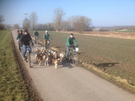 Für den weiteren Konditionsaufbau und die Vertiefung des ungezwungenen Laufens im Pack hat sich das Fahrradtraining als nahezu ideal erwiesen. Die Junghunde lassen sich so mit mehr Ruhe auf die Situation ein und das ganze Pack (mitsamt der Equipage) steigert die Kondition.